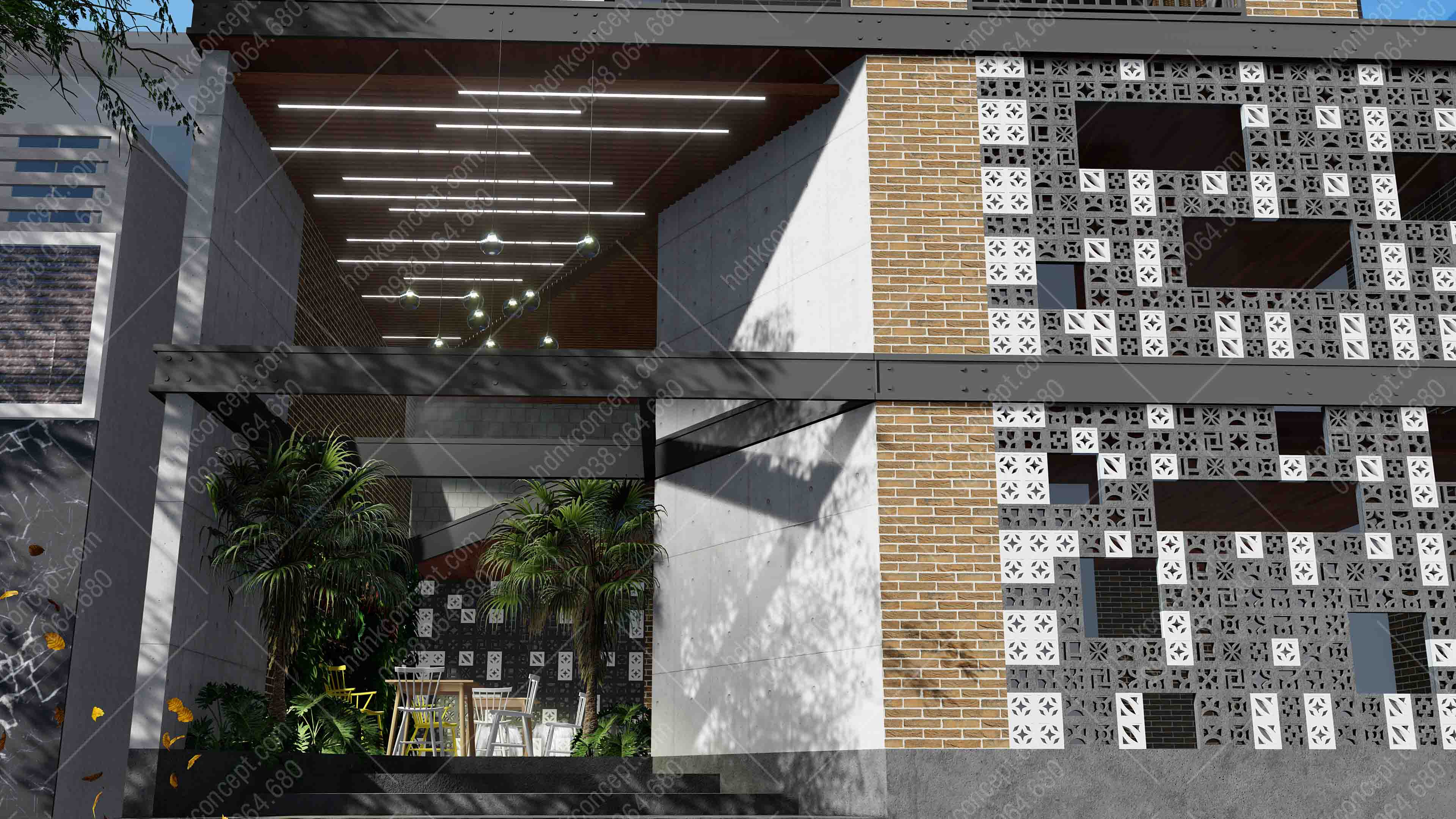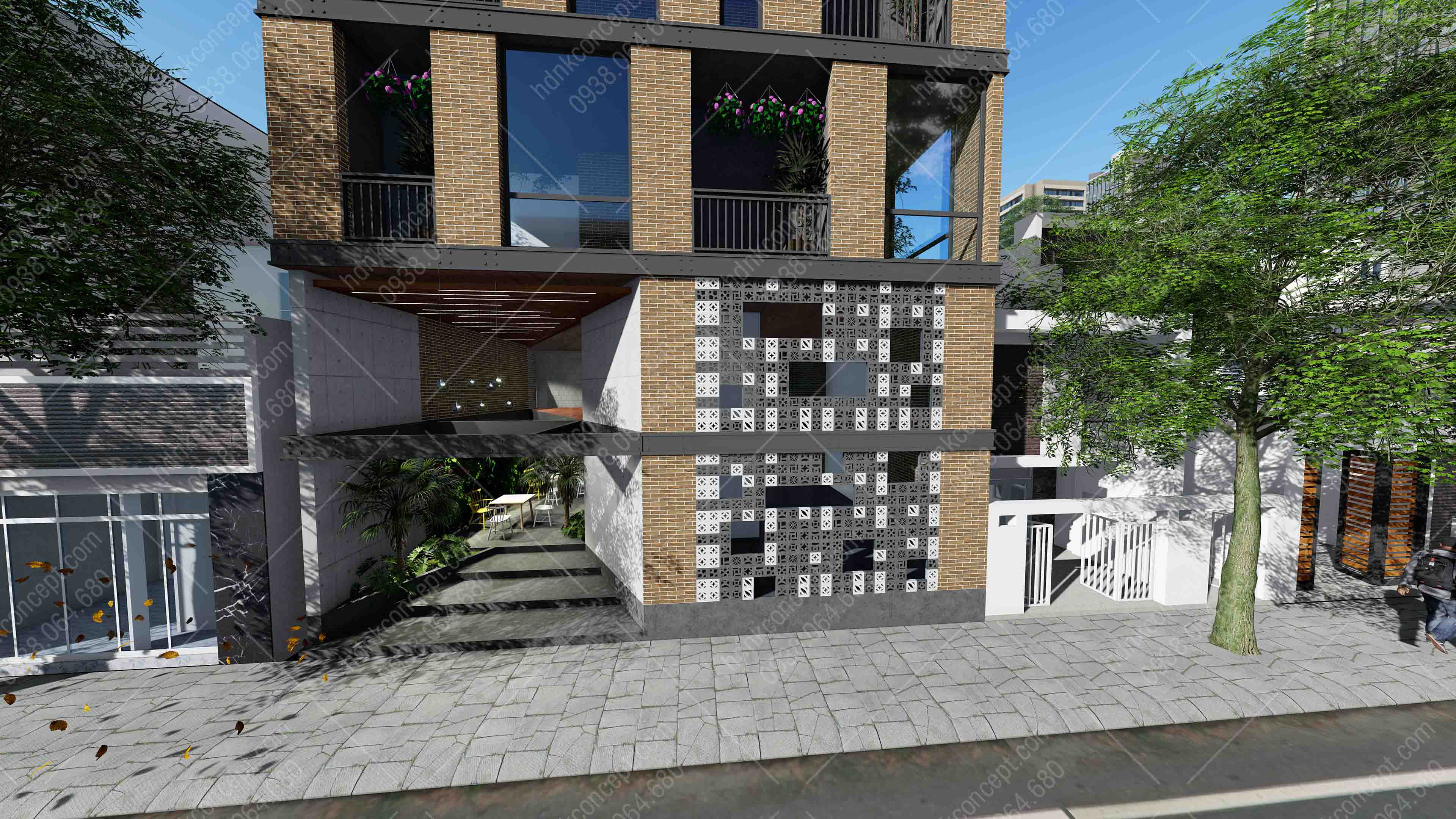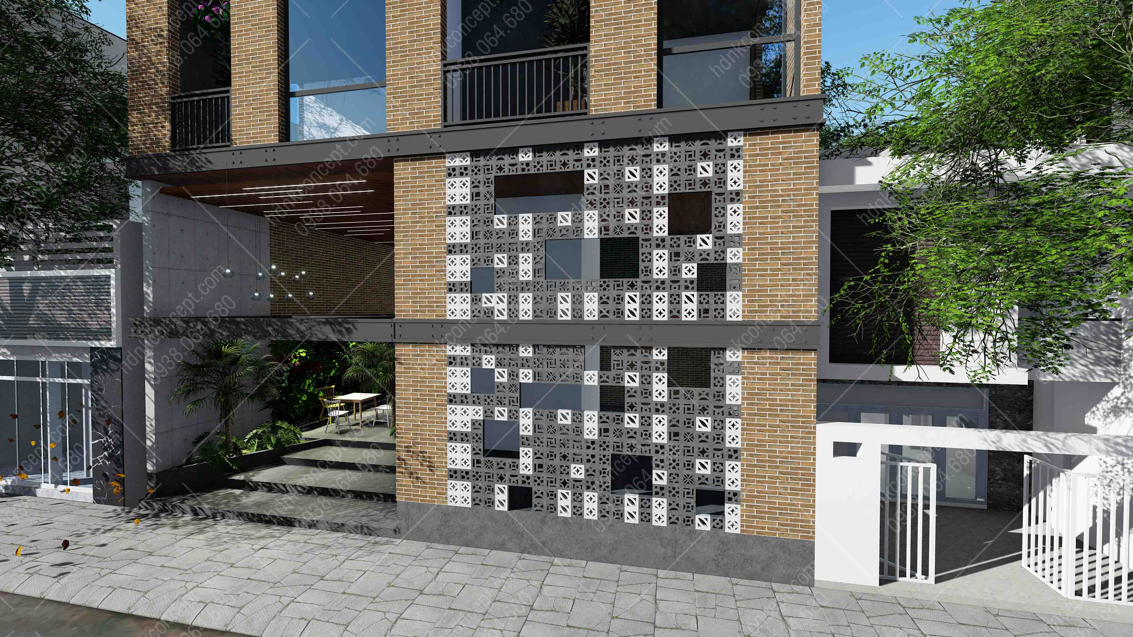 Mặt tiền được thiết kế phối 2 màu gạch cổ và màu xám, kết hợp với bông gió màu xám và màu trắng.