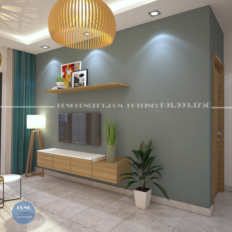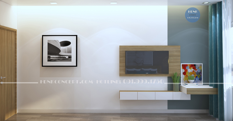 Mảng tivi trong thiết kế thi công nội thất căn hộ Wilton Tower chúng tôi sử dụng 1 tủ tivi nhỏ bên dưới và 1 bàn trang điểm bên trên