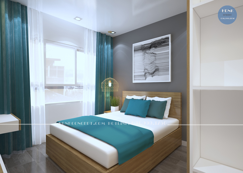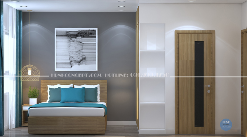 Phòng ngủ chính hay phòng ngủ Master trong thiết kế nội thất căn hộ Novaland 2 phòng ngủ Wilton Tower nhấn mảng đầu giường bằng gam màu xám . giường cũng sử dụng chất liệu gỗ xồi làm nhấn cho căn phòng thêm trang trọng.