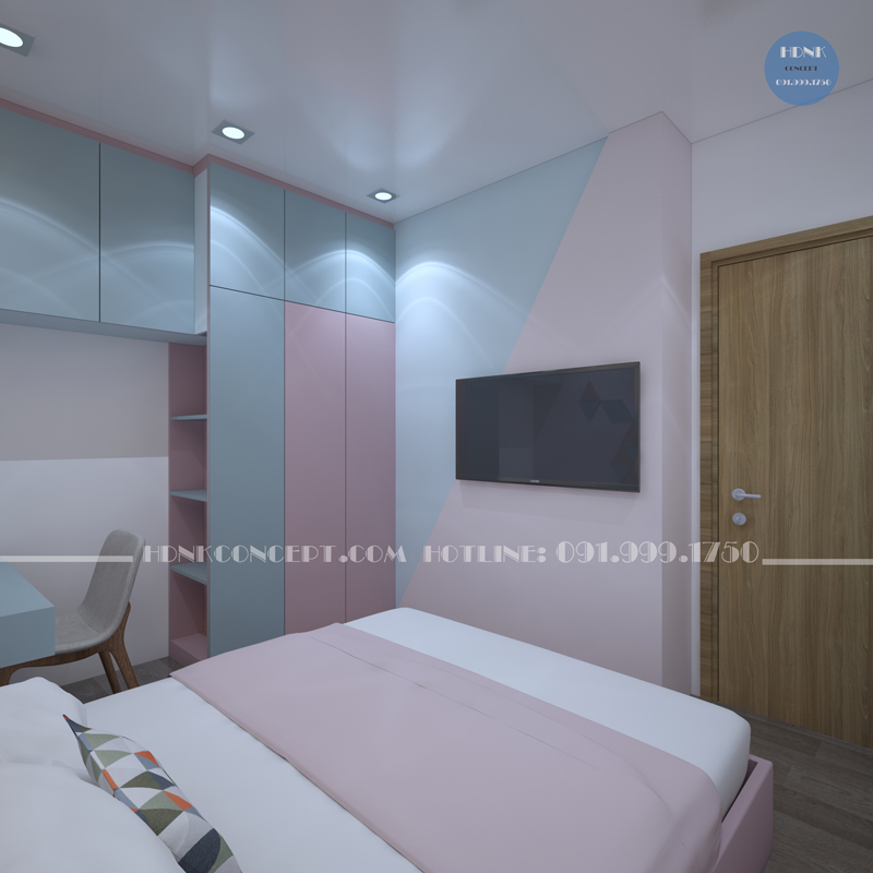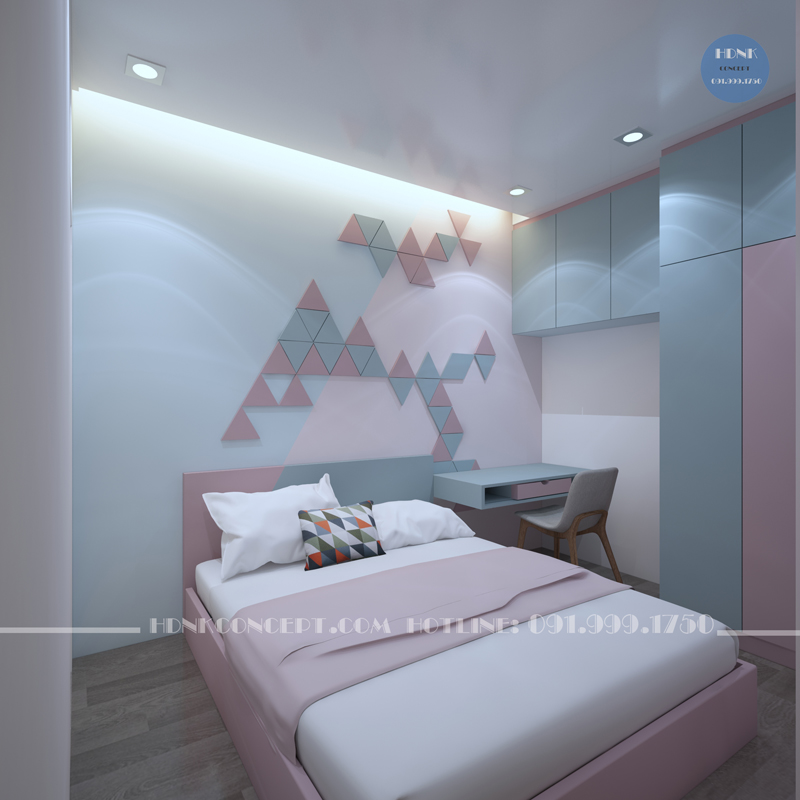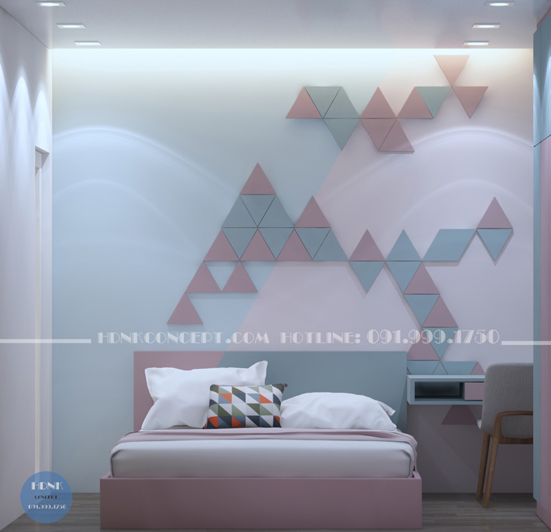 Phòng ngủ bé gái , bé gái thích 2 màu xanh nhạt và màu hồng nên chúng tôi sử dụng ở đây là chất liệu MDF sơn màu hồng kết hợp với màu xanh.