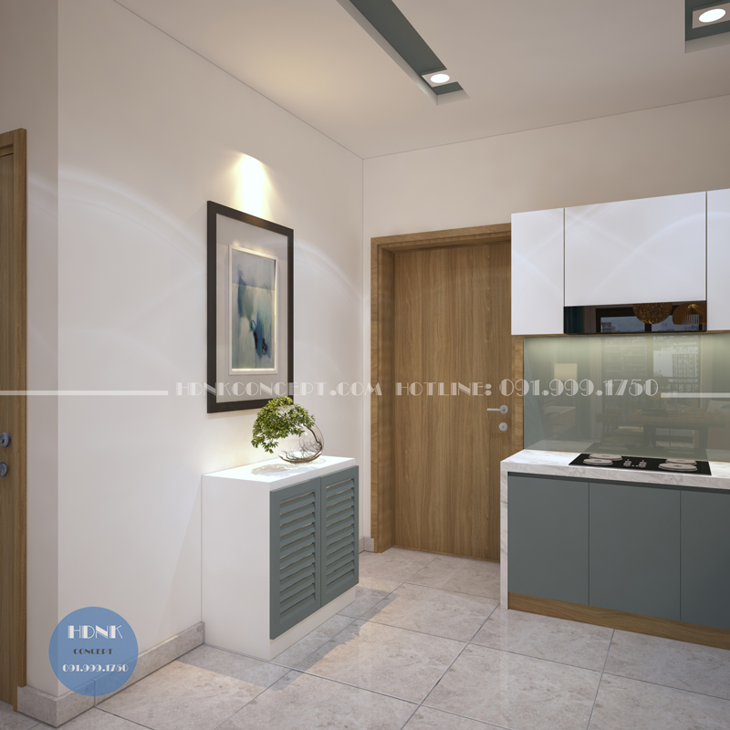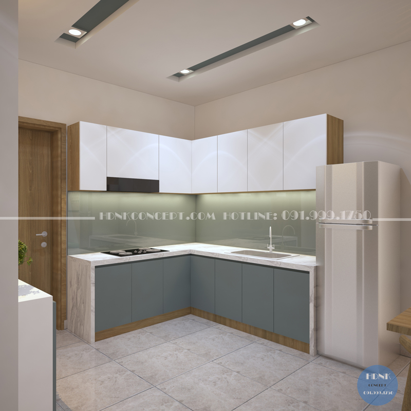Tủ bếp có 2 gam màu chính là màu xanh sơn cho tủ bếp dưới và màu trắng sơn cho tủ bếp trên trong thiết kế thi công nội thất căn hộ chung cư Wilton Tower Novaland