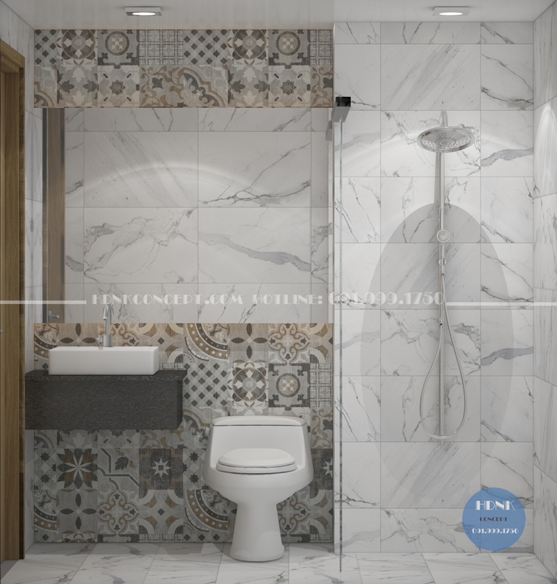 Mảng toilet được chúng tôi nhấn mảng gạch bông nhẹ ở góc mảng kính trang trí và toàn bộ phòng được lát gạch vân đá 300 x 600 trong thiết kế nội thất căn hộ chung cư Novaland Wilton Tower.