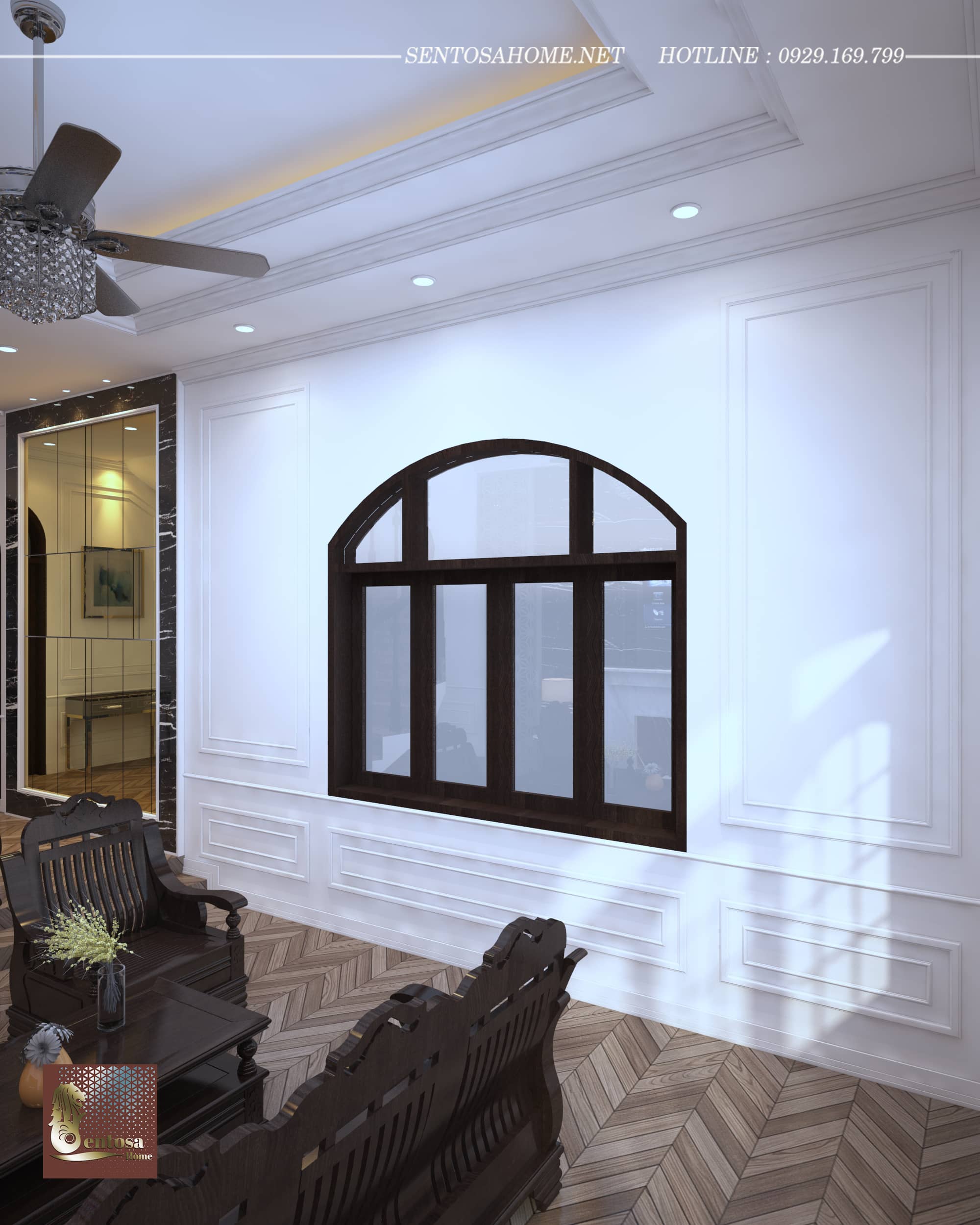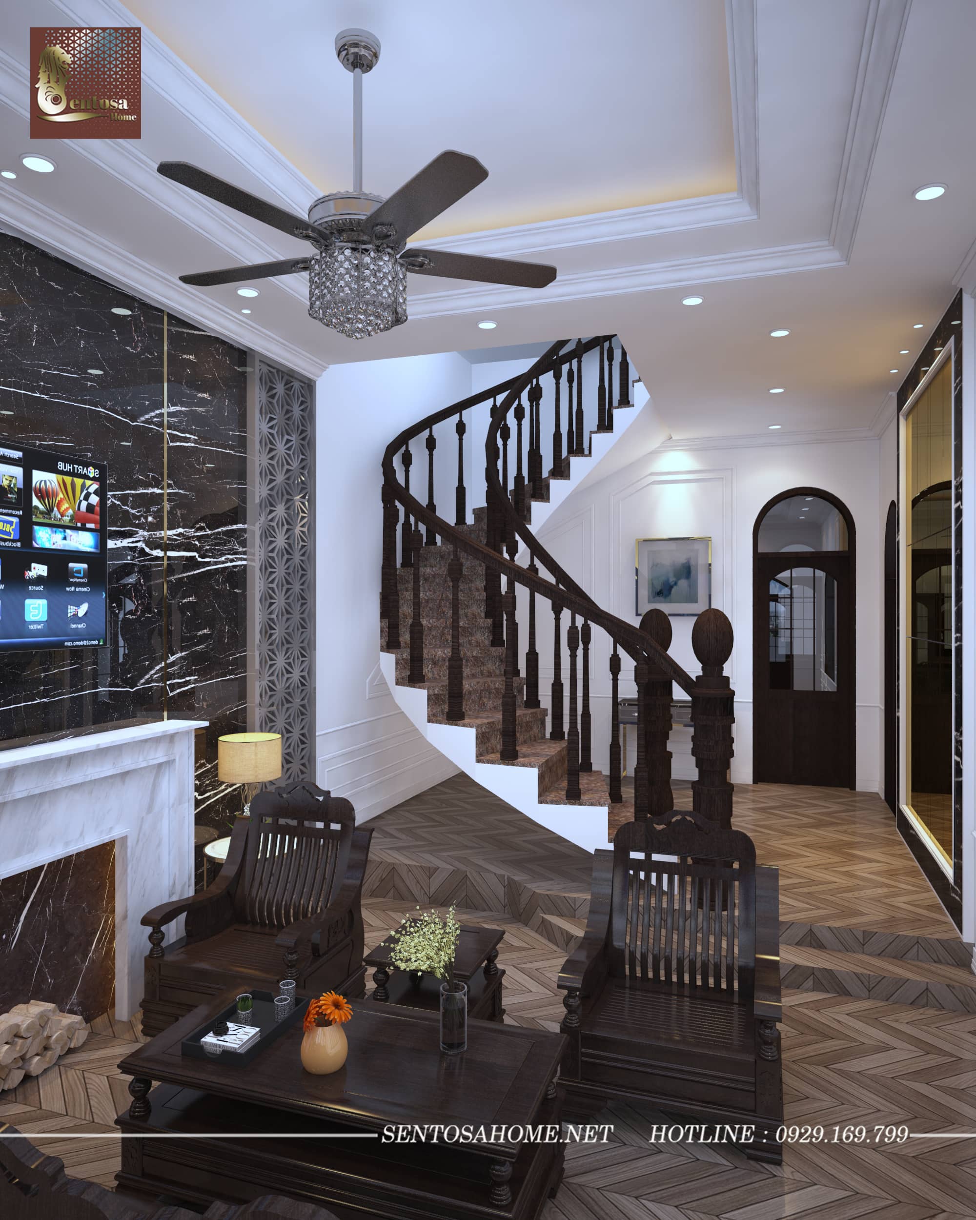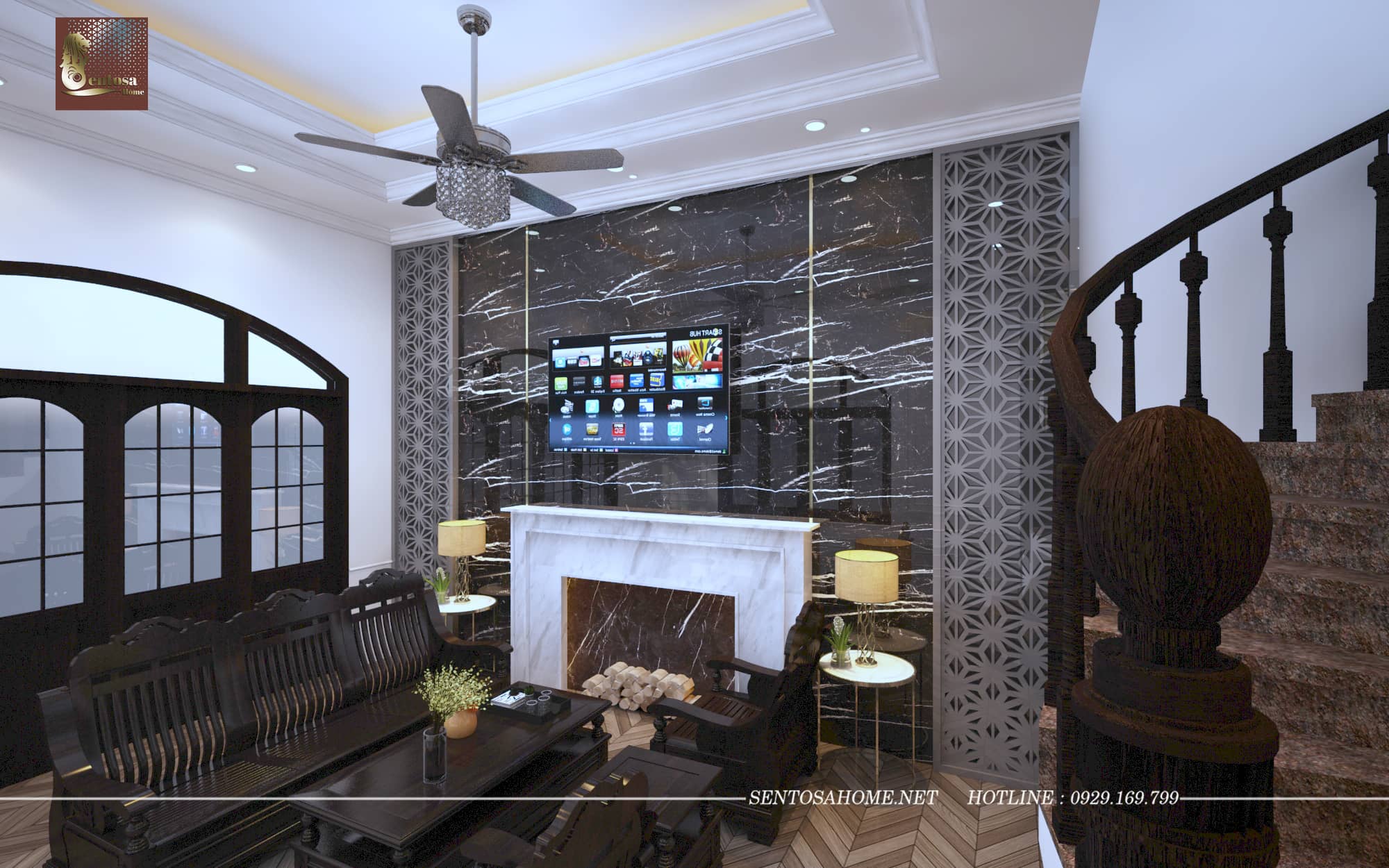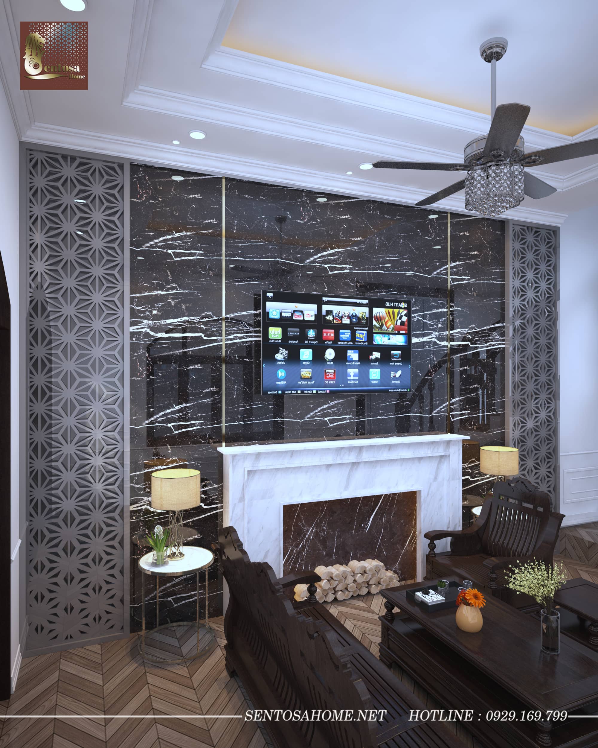 Nội thất phòng khách căn biệt thự sử dụng vật liệu sàn gỗ xương cá rất sang trọng. Không gian phòng khách được thiết kế nội thất tận dụng tối đa ánh sáng và luồng gió tự nhiên với ban công rộng sẽ khiến cho không gian mát mẻ và thông thoáng hơn. Mảng tường phòng khách được nhấn bằng vách gỗ hoa văn cắt CNC bên cạnh đá Marble đen và họa tiết lò sưởi .