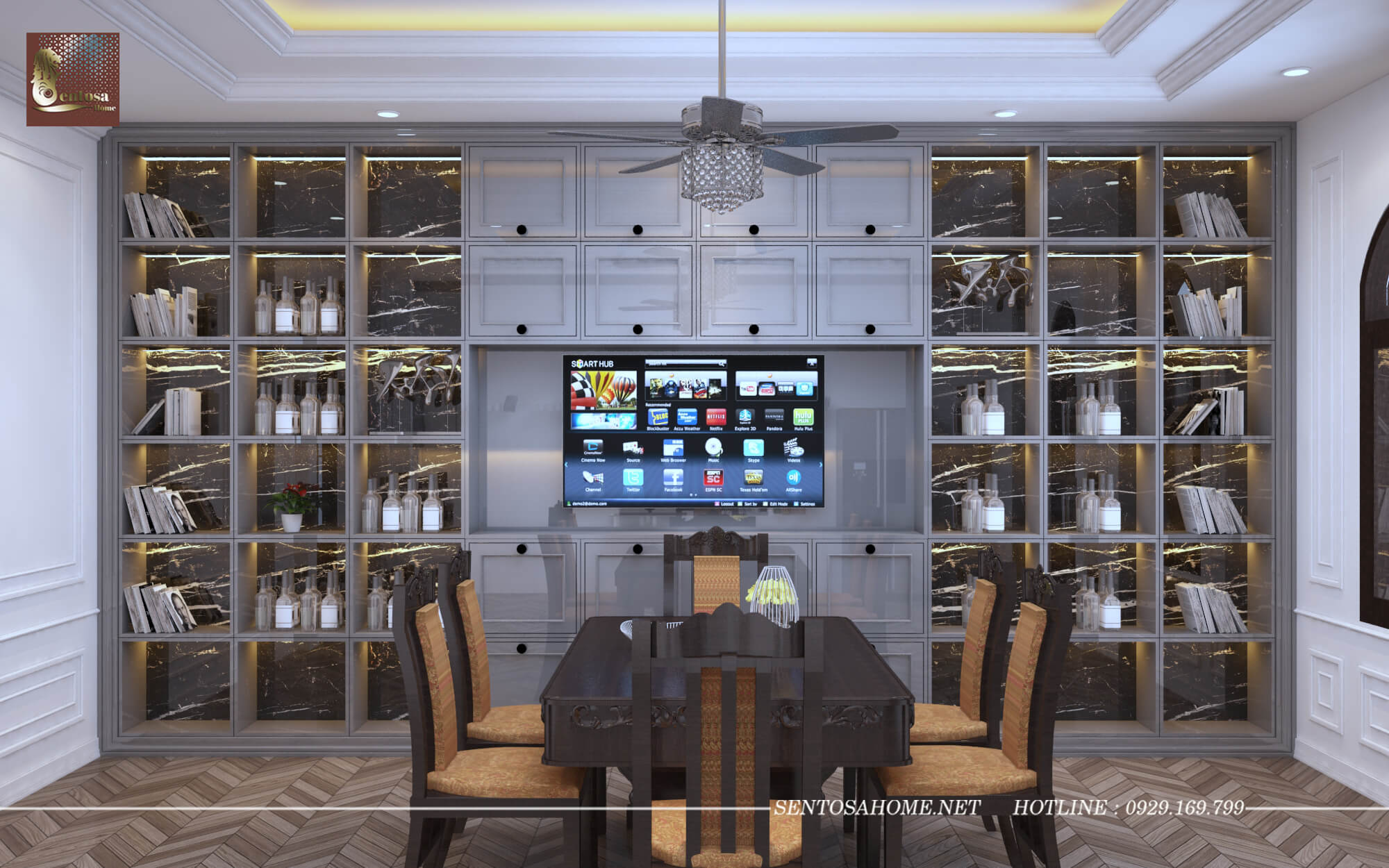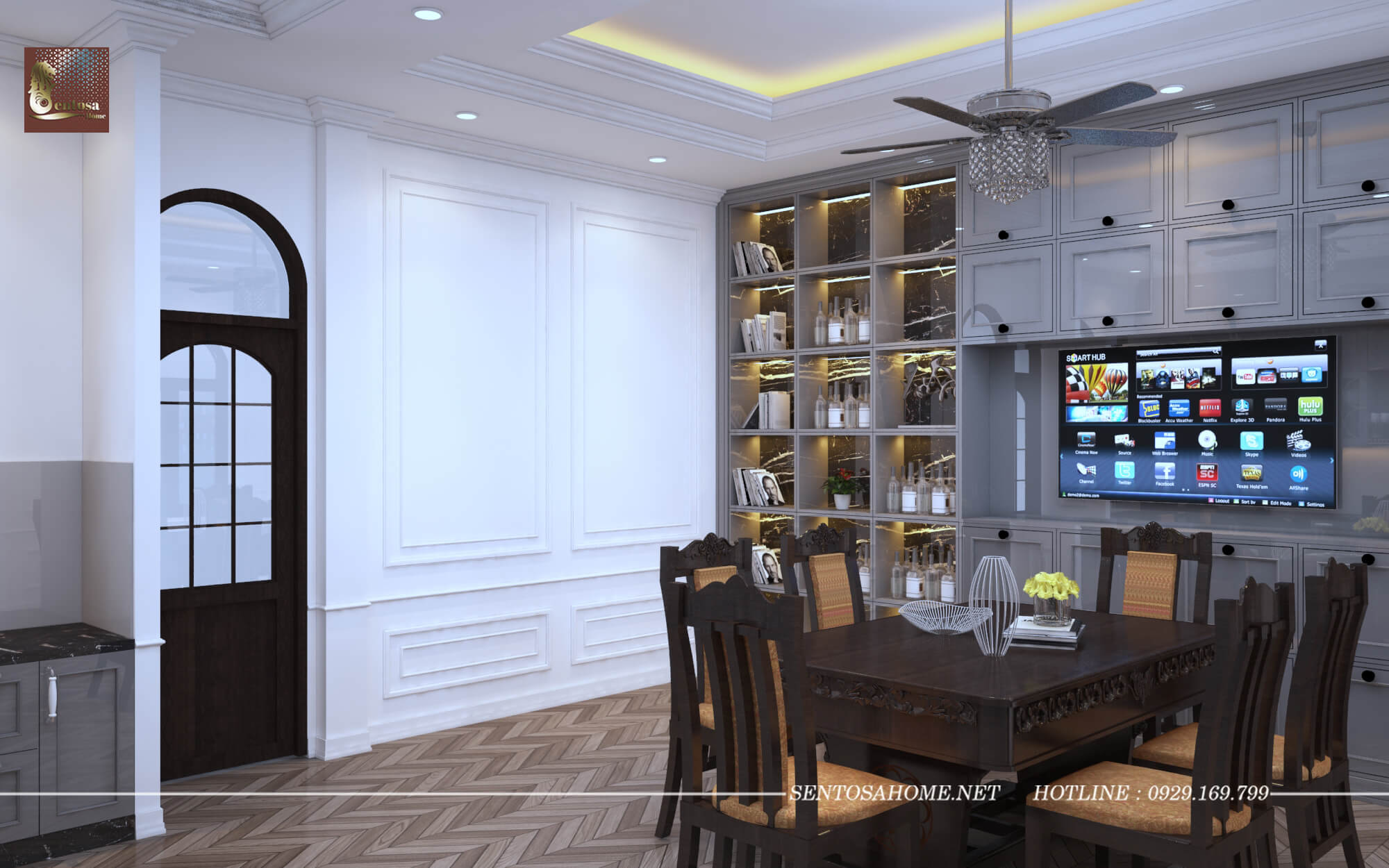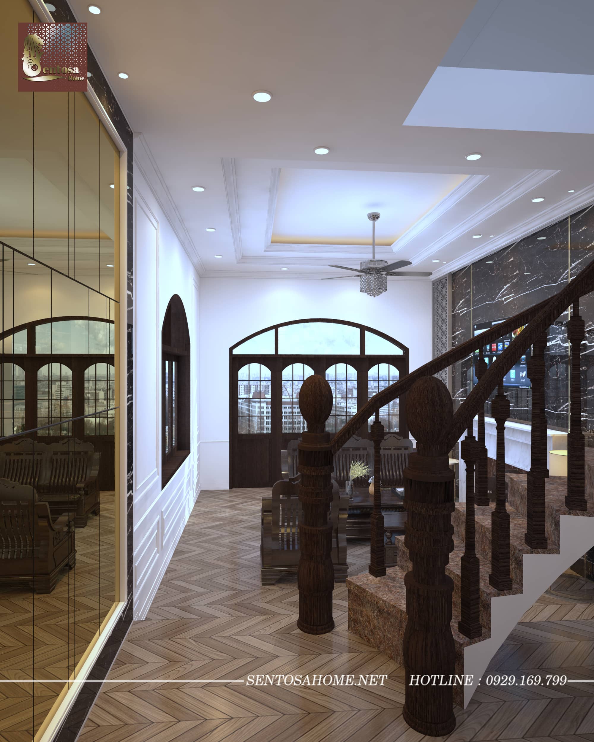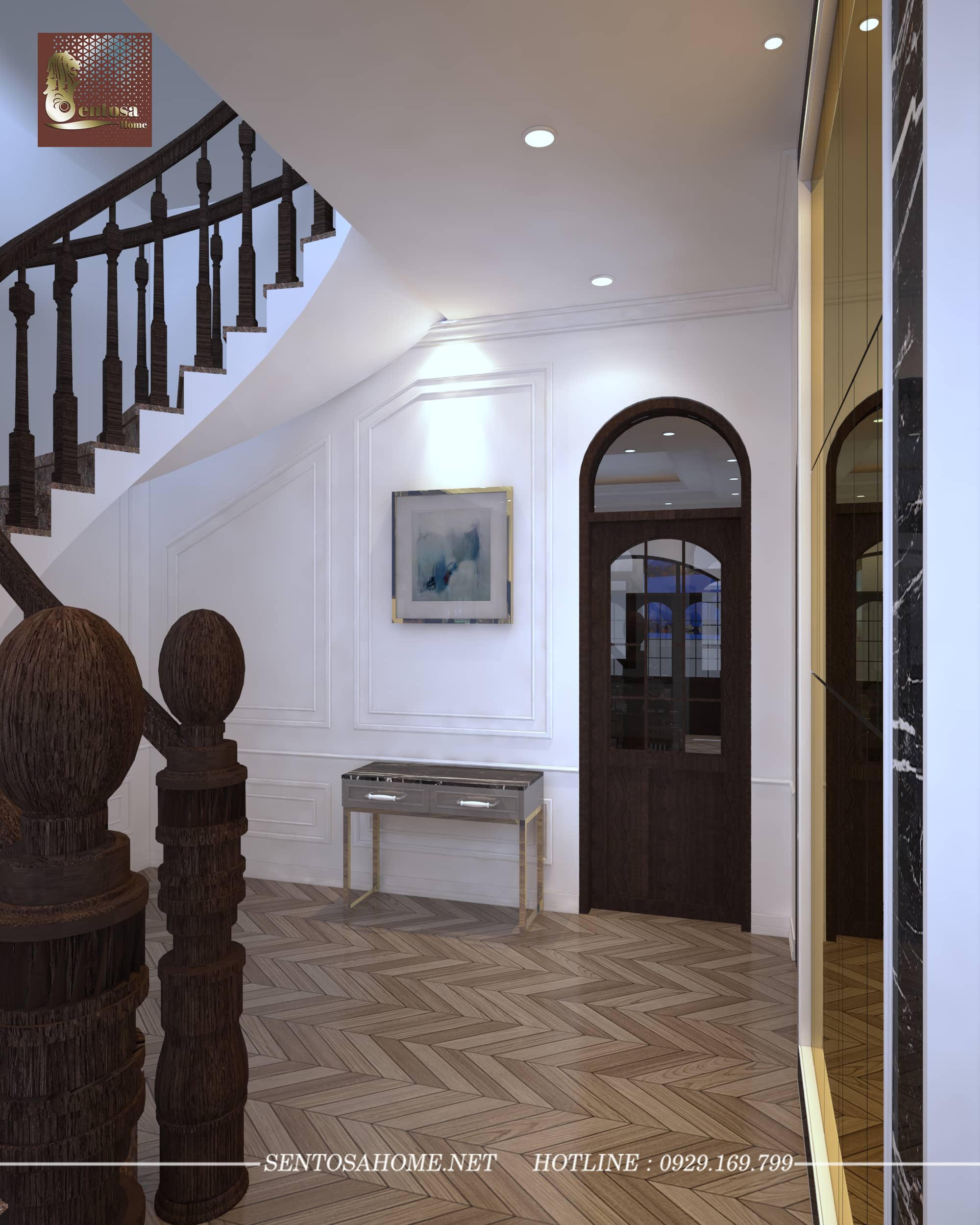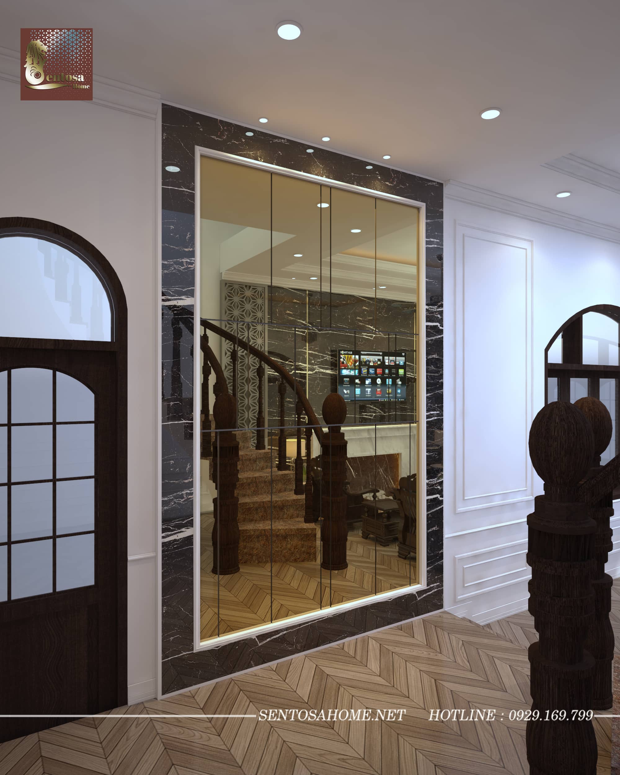 Nội thất phòng khách căn biệt thự sử dụng vật liệu sàn gỗ xương cá rất sang trọng. Không gian phòng khách được thiết kế nội thất tận dụng tối đa ánh sáng và luồng gió tự nhiên với ban công rộng sẽ khiến cho không gian mát mẻ và thông thoáng hơn. Mảng tường phòng khách được nhấn bằng vách gỗ hoa văn cắt CNC bên cạnh đá Marble đen và họa tiết lò sưởi .