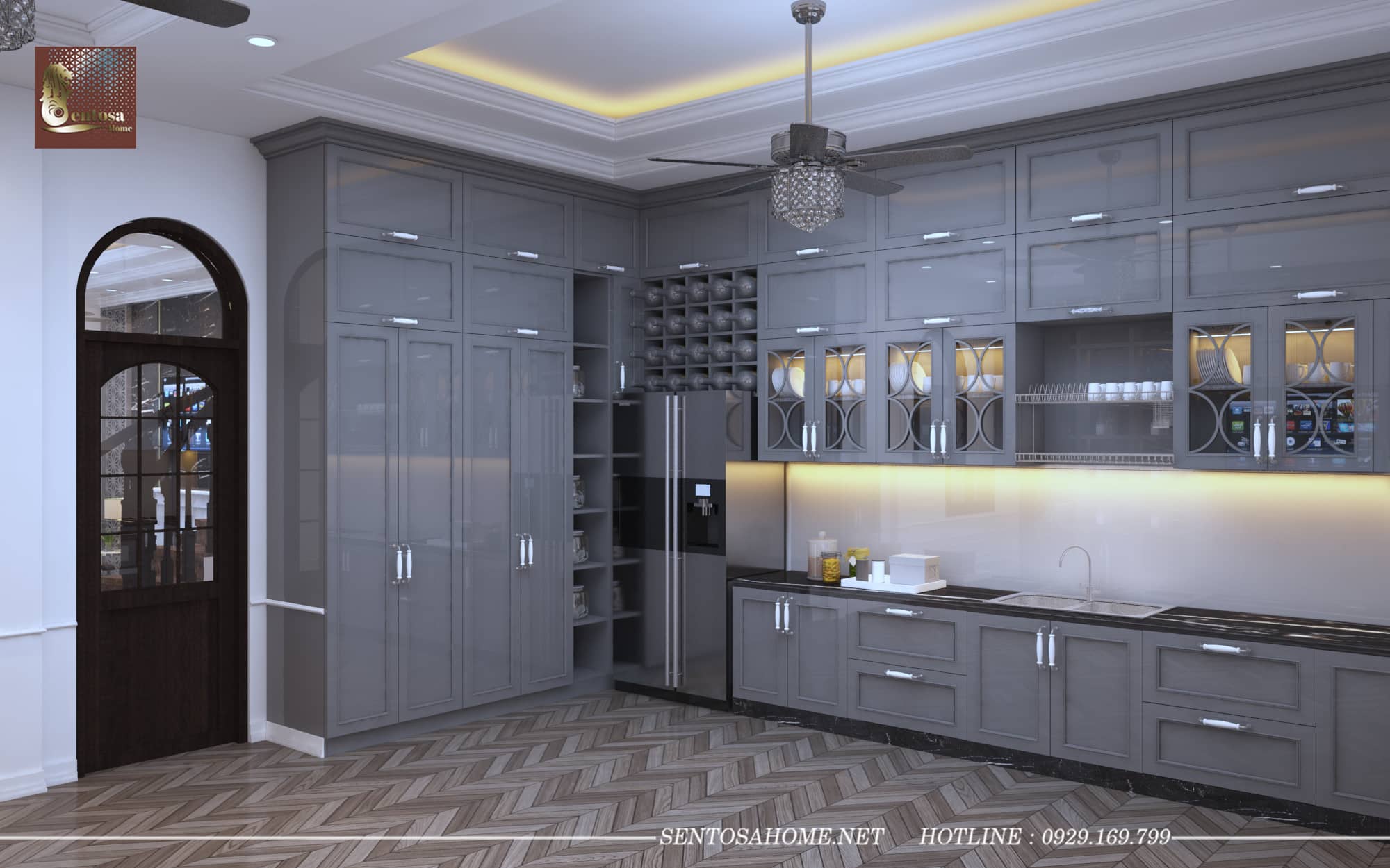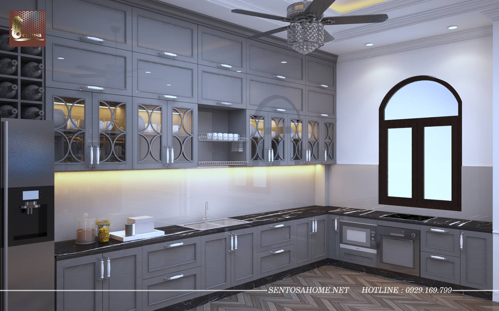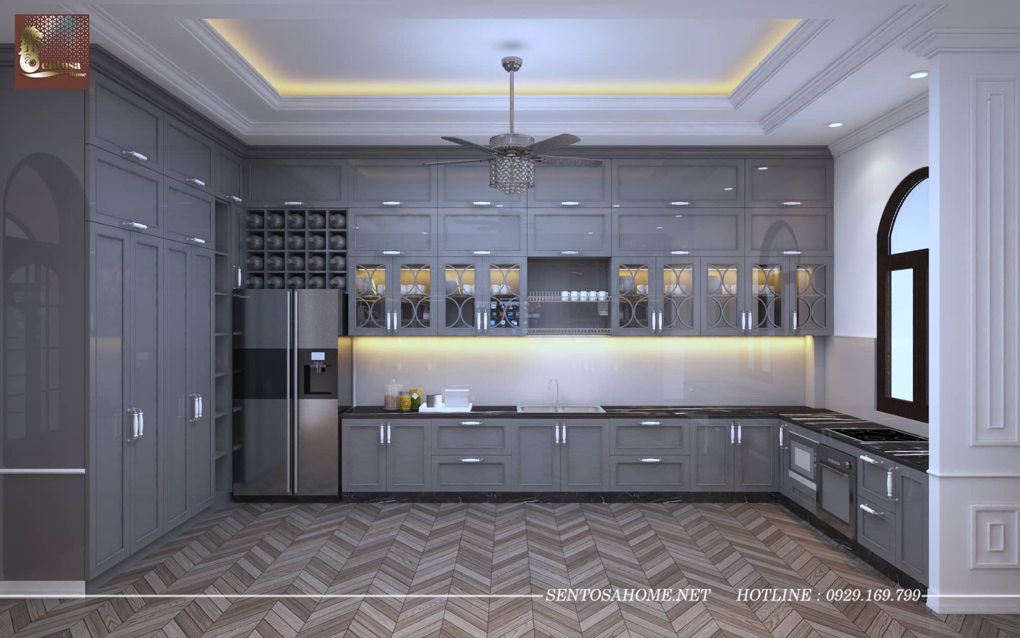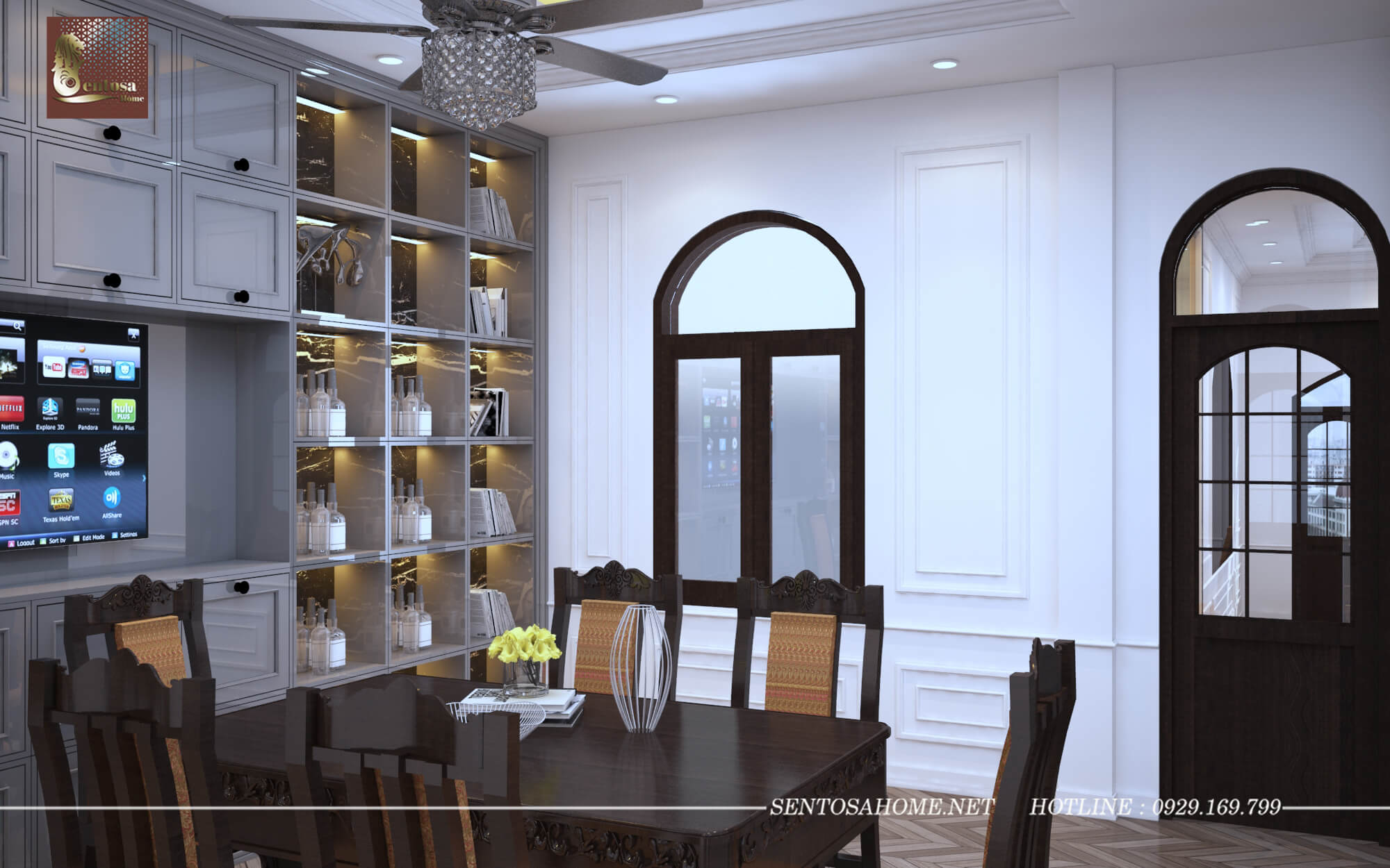 Nội thất phòng khách căn biệt thự sử dụng vật liệu sàn gỗ xương cá rất sang trọng. Không gian phòng khách được thiết kế nội thất tận dụng tối đa ánh sáng và luồng gió tự nhiên với ban công rộng sẽ khiến cho không gian mát mẻ và thông thoáng hơn. Mảng tường phòng khách được nhấn bằng vách gỗ hoa văn cắt CNC bên cạnh đá Marble đen và họa tiết lò sưởi .